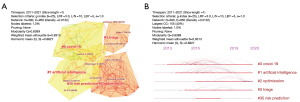 The keywords were identified by VOSviewer and CiteSpace. Both tools extracted all keywords from the included articles based on the citation index service of WoS core collection database. Finally, a total of 2,504 keywords were identified from the included articles. Among them, 93 keywords were high frequency and included in the analysis. The co-occurrence of high-frequency keywords were divided into six clusters with a total link strength of 1,835 (Figure 3A). “Machine learning” was the most frequent keyword (147 occurrences, 165 links, and 395 total link strengths), and was linked to 88 other high-frequency keywords (Figure 3B). “Artificial intelligence” (51 occurrences, 52 links, and 136 total link strengths), “risk” (43 occurrences, 61 links, and 146 total link strengths), “models” (42 occurrences, 63 links, and 144 total link strengths), and “mortality” (37 occurrences, 59 links, and 149 total link strengths) were the other four top high frequency keywords. Other high frequency keywords that ranked in the top ten included “classification”, “prediction”, “care”, “deep learning”, and “COVID-19”.