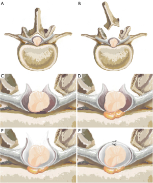 Surgical reduction is usually recommended for symptomatic patients with aggravation or signs of myelopathy. The goal of the surgical procedure lies is to detether the spinal cord, with measures taken to prevent reherniation (16). Laminectomy is a commonly used technique, and partial facetectomy can also be performed to increase the lateral exposure to gain access to the ventral dural surface without extensive spinal cord retraction (17-19). Adequate exposure is essential for the manipulation of herniated spinal cord detethering and dural defect repair, reducing undesired neurological deficits (20). The technique for dural defect management is still debatable, including enlarging or repairing by direct suture or graft materials, such as fascial patches, a muscle or fat graft, bovine pericardium, or artificial dural substitutes (19,21-24). Due to limited cases of this disease and on the variety of closure techniques, the optimal surgical strategy is still unclear.