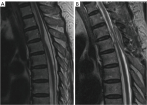 - Samuel N, Goldstein CL, Santaguida C, et al. Spontaneous resolution of idiopathic thoracic spinal cord herniation: case report. J Neurosurg Spine 2015;23:306-8. [Crossref] [PubMed]