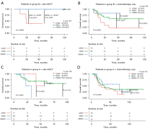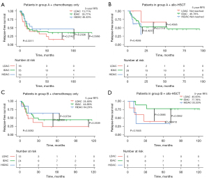 Among the 188 enrolled patients, 130 (69.1%) received only chemotherapy as consolidation and 58 (30.9%) patients underwent allo-HSCT. To eliminate the potential influence of allo-HSCT on outcomes, we performed a stratified analysis by allo-HSCT status. Similar to the entire cohort, in group B, patients with IDAC showed superior OS compared with those with LDAC, whether in the allo-HSCT group (P=0.0075, Figure 4A) or chemotherapy-only group (P=0.0455, Figure 4B). Similarly, in group A, patients with IDAC had no association with better OS, whether they received allo-HSCT (P=0.8978, Figure 4C) or not (P=0.3775, Figure 4D). RFS was not statistically different among the 3 consolidation regimens in both group A and B, whether receiving allo-HSCT or not (Figure 5).