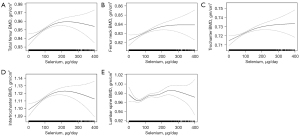 We further used the GAM to examine the dose-response association, and found an inverted U-shape association between dietary selenium intake and BMD levels (Figure 1). Overall, participants tended to have increased levels of BMD as the dietary selenium intake increased when dietary selenium intake was below the turning point, and then the BMD decreased as the dietary selenium intake increased when dietary selenium intake was higher than the turning point. Furthermore, we used a log likelihood ratio test which showed significant differences between the linear model and segmented regression model, indicating that the associations between dietary selenium intake and BMD levels of the total femur (P<0.001), femur neck (P=0.003), trochanter (P=0.005), intertrochanter (P<0.001), and lumbar spine (P=0.004) were nonlinear.