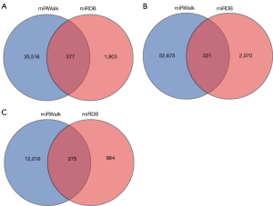The probes that at least 100% of samples in any 1 condition out of 2 conditions had flags in “Detected” were chosen for further analysis. To identify differentially expressed miRNAs, the threshold set for regulated genes was a fold change ≥2.0 and t-test P value ≤0.05. Predicted target genes of differentially expressed miRNAs were obtained through the miRDB and miRWalk databases. Gene Ontology (GO) analysis and Kyoto Encyclopedia of Genes and Genomes (KEGG) analysis were applied to determine the biofunctions and regulated pathways of target genes.